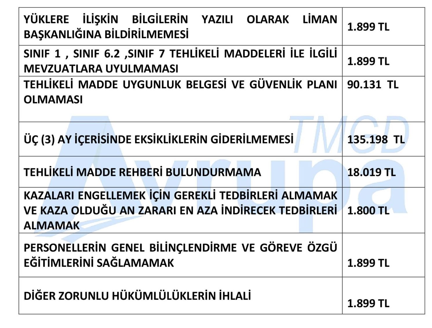 2020 yılında uygulanacak olan Tehlikeli Maddelerin Denizyolu ile Taşınması Hakkındaki İdari Para Cezaları aşağıdaki tabloda belirtilmiştir.