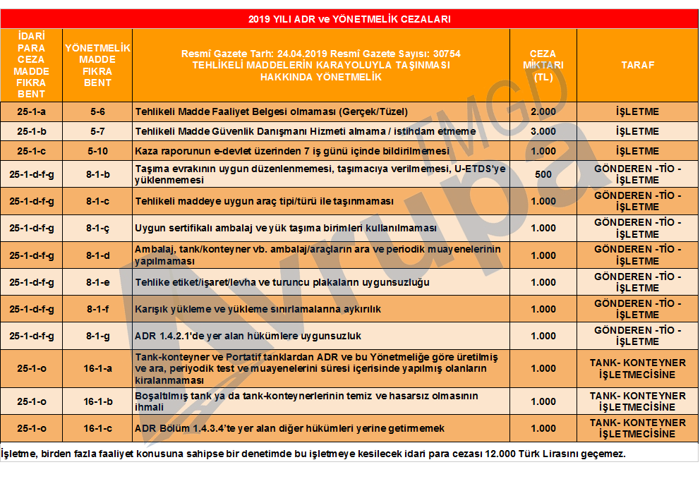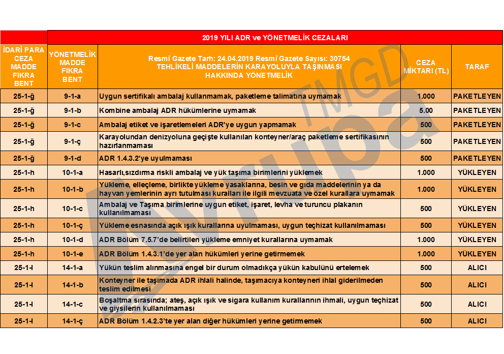 Taraflara kesilebilecek 2019 yılı ADR güncel cezalarının tüm detaylarına buradan ulaşabilirsiniz.