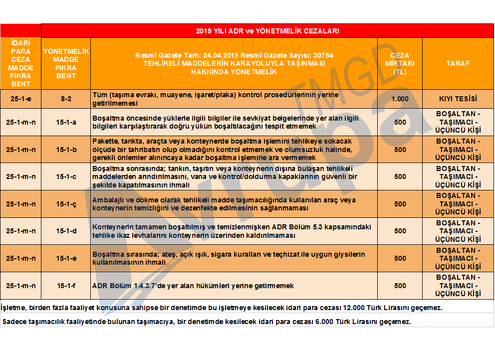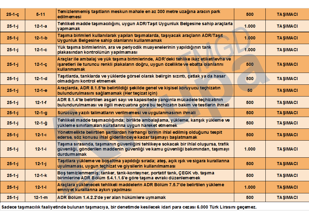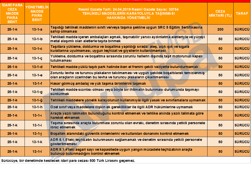 24 Nisan 2019 Tarihli Tehlikeli Maddelerin Karayoluyla Taşınması Hakkında Yönetmelik ADR Ceza Tablosu