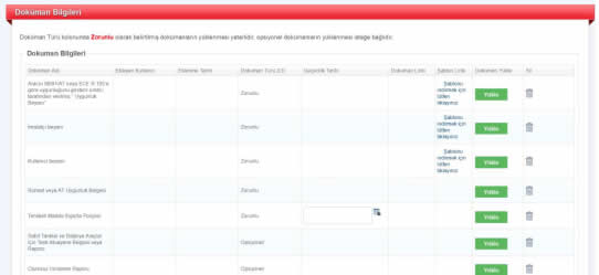 - Araç türüne göre farklılaşan zorunlu dokümanlar sisteme yüklenir. Kullanıcı ve imalatçı beyanları şablon olarak indirilip imzalandıktan sonra yüklenir. Kullanıcı Beyanı araç sahibi kişi/firma yetkilisi tarafından elle doldurulur, kaşelenir, imzalanır ve inceleme öncesi uzmana teslim edilir. Eğer firma yetkilisi inceleme yerinde değilse bu durumda doldurup kaşeleyerek imzaladığı beyanı mail atar, bu beyan çıktı alındıktan sonra araç kullanıcısı şoföre (isim soyisim yazılarak) imzalatılır. Opsiyonel dokümanların yüklenmesi zorunlu değildir.